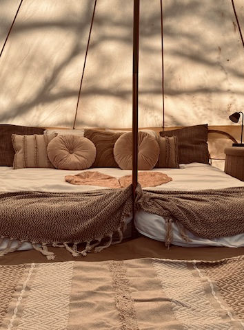 Bij ons kun je genieten van een unieke glampingervaring! We verhuren drie comfortabele glampingtenten, elk voorzien van een tweepersoonsbed, een koffiezetapparaat en stopcontacten. Elke tent heeft een eigen mini-terrasje voor een ontspannen moment in de buitenlucht. Het sanitairblok wordt gemeenschappelijk gedeeld door alle tenten. Bovendien kun je tussen 9u en 23u gebruik maken van ons binnenzwembad voor een verfrissende duik. Perfect voor een ontspannen en luxe kampeerervaring!